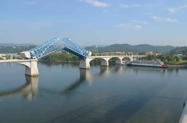 The Tennessee Department of Transportation Sunday morning conducted quarterly testing on the Market Street Bridge in downtown Chattanooga. The bascule bridge spans the Tennessee River between downtown Chattanooga and the Northshore District. At the time of its completion in 1917, the 300-foot main span was the longest rolling-lift bascule span in the world. The bridge is listed on the National Register of Historic Places. Four times per year, TDOT closes the bridge to test its hinge mechanism, as mandated by the US Coast Guard. (Photo by David Laprad. Some information from TDOT.)