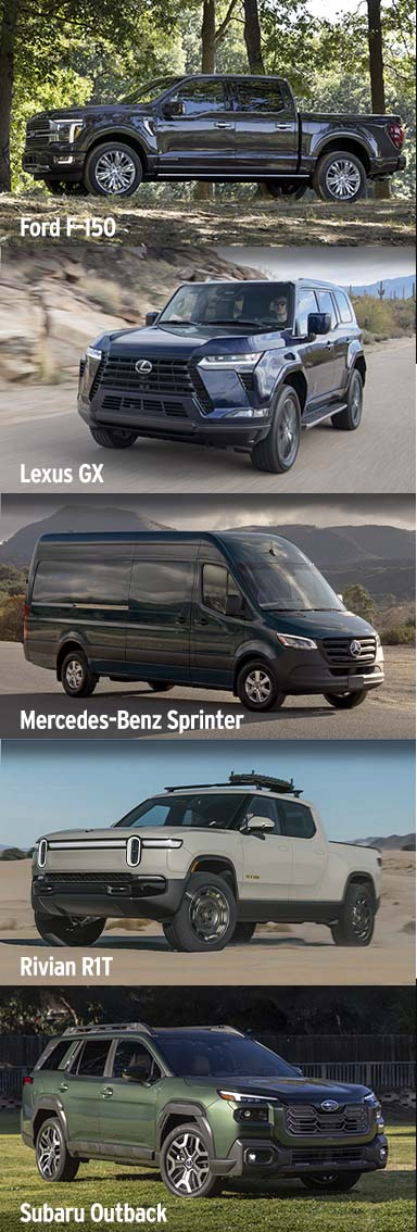 Camping pros will like the Wilderness trim for its rugged all-terrain tires, protective lower-body armor, water-repellent upholstery and 9.5 inches of ground clearance that rivals most Jeeps.