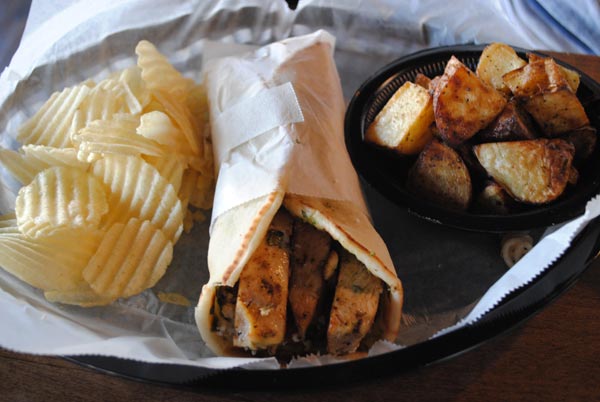 My dining partner went with the chicken basil-pesto gyro, filled with homemade basil pesto, tomatoes and feta cheese. I got to try a bite, and this wrap was as lovely as it sounds. The pesto was not overpowering, and complemented the feta cheese and chicken blend. She chose the roasted new potatoes as her side, and was given a tasty pork based tomato sauce to dip these with. Taziki’s also has daily specials. Monday is the Portobello mushroom sandwich. Tuesday is the turkey club pita. Wednesday is the spanakopita roll-up. Thursday is Mediterranean tacos. Friday through Sunday is the pasta special that includes grilled chicken with penne pasta tossed in homemade balsamic vinaigrette on a bed of mixed lettuces toped with feta, tomatoes and fresh basil. All of these specials, except the pasta special, are served with chips and a healthy side.
