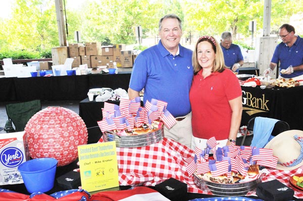 Judge W. Neil Thomas III is the go-to man for wild rice soup, according to the results of the 2013 Gourmet Guys competition. Gourmet Guys is a food-tasting gala pitting dozens of chefs against each other in an amateur event. Attendees are able to taste all kinds of appetizers, soups, sides, salads, entrees and desserts, and vote for their favorite chefs. Judge Thomas beat out a garden gazpacho and a lentil soup to claim the prize in the soups category. Other winners include Don Musick, who submitted a three pesto torte in the appetizers category; Lester Perreault, whose peanut butter dessert sweetened up the event; and Mike Brown, whose chicken francesca was voted best main dish. Sydney Franklin (peanut butter and jelly cookies) and Benny Scaduto (crispy fried risotto balls) tied for the popular vote, while Tamarah Daniel won best booth. Three Chattanooga Rotary Clubs teamed up to sponsor the 2013 Gourmet Guys Food Tasting Gala on June 22 at the First Tennessee Pavilion. Proceeds from the event will be used to support initiatives for needy children locally and internationally. Pictured: Chef Mark Kramer and wife with his smoked beef tenderloin. (Photo provided)