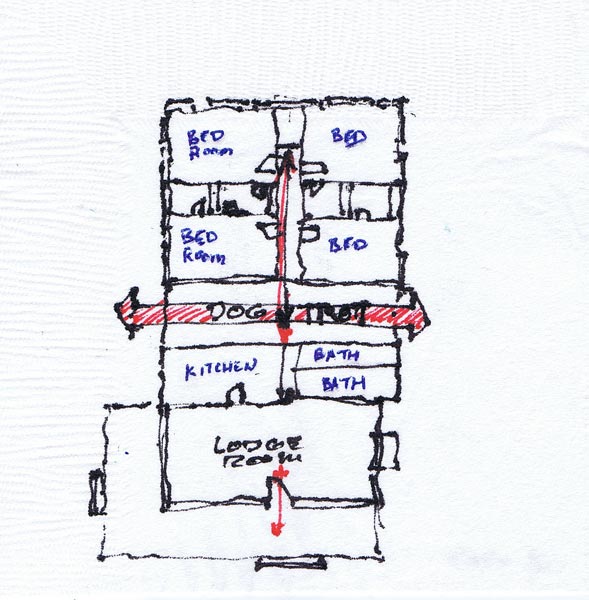 This breezeway between the two buildings provides additional activity space where visitors may hang rain-soaked jackets or sit on benches while gathering fishing gear for a day on the lake. As can be seen in the sketch, the main circulation path becomes the dogtrot breezeway providing entry into either the lodge facilities or sleeping quarters. This configuration maintains the cabin’s front porch privacy and preserves the view of the adjacent lake and forest.