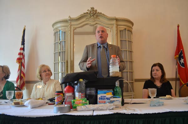 “Meth is my life,” said Jim Derry of the Tennessee Methamphetamine and Pharmaceutical Task Force as he spoke at the Women’s Council of Realtors luncheon Wednesday, August 14 at the Choo-Choo Hotel, “but not in the way you think.” Derry spoke passionately to the group and its sponsors, including First American Home Buyer Protection and Full Disclosure Inspection, about the dangers of meth to a community. Most startling was the number of meth labs seized to date in Hamilton County: 820. To aid Realtors researching properties on behalf of clients, Derry pointed the group to www.rid-meth.org, which contains a searchable database of meth labs seized in an area. Those in the room gasped as Derry displayed the list of labs seized locally on a pull-down screen and scrolled through the addresses. Pictured: Derry with an assortment of common household items used in the production of meth. (The bottle on the podium was inert. Photo by David Laprad.)