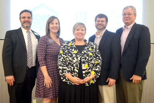 Pictured Wednesday, Aug. 10 at the Chattanoogan during the annual economic update luncheon hosted by the Greater Chattanooga Association of Realtors (GCAR) and the Homebuilders Association of Greater Chattanooga are (L-R): GCAR president Nathan Walldorf; GCAR CEO Carol Seal; Jessica Lautz, managing director of survey research and communications for the National Association of Realtors and the guest speaker; Chris Mabee, 2016 president of the Homebuilders Association; and Terry Greene, executive officer of the Homebuilders Association.