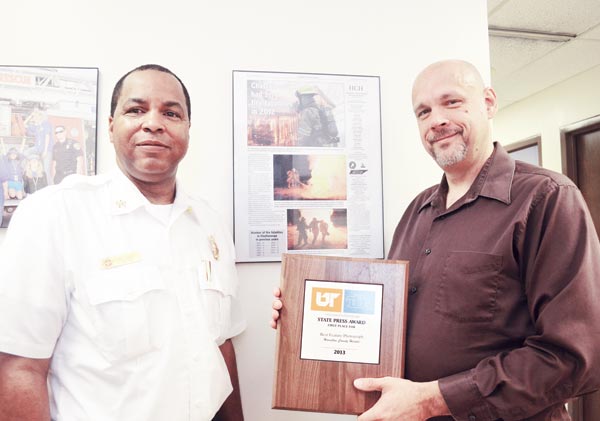 The Hamilton County Herald won first place in the category for “Best Feature Photograph” at the 2013 Tennessee State Press Association Awards, held last week in Nashville. The award-winning photograph was taken by news editor David Laprad during the Chattanooga Fire Department’s live training in February 2012, when recruits set fire to an abandoned house and then put into practice the fire fighting skills they had learned up to that point. The photograph was published as part of a feature titled “Chattanooga had zero fire fatalities in 2012.” Pictured: Chattanooga Fire Department Chief Lamar Flint and Laprad standing next to a tear sheet of the feature, currently hanging on a wall at the fire department. (Susanne Reed)