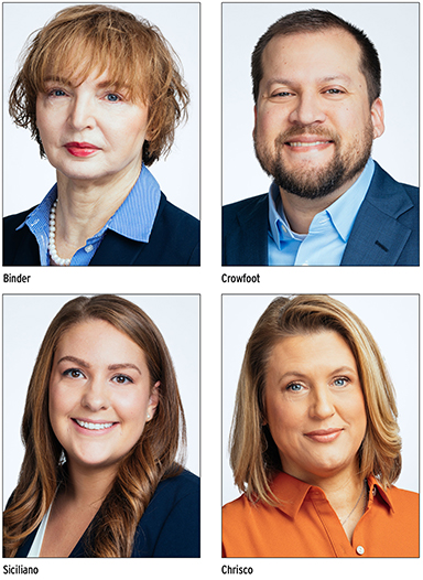 Josh Crowfoot and Kathleen Siciliano join the firm as associate attorneys, while Brenda Binder and Kim Chrisco will serve as paralegals.