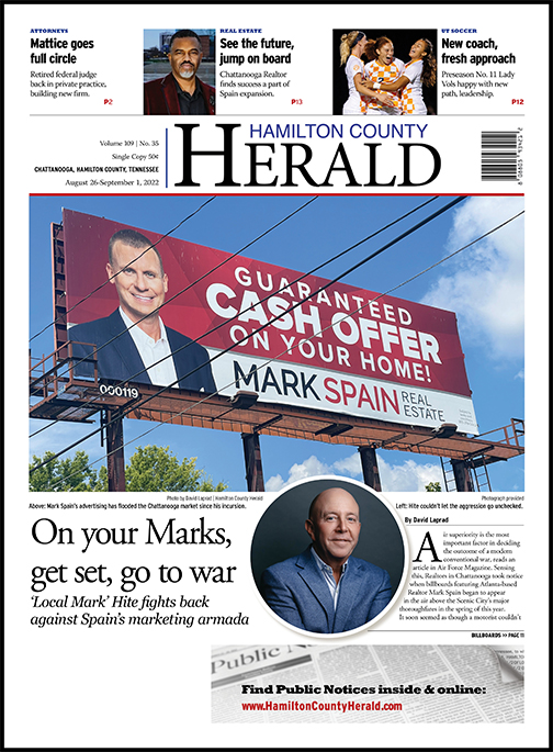 One thing Hite says he won’t do is purchase as many billboards as Spain has, primarily because he’s convinced the Atlanta Realtor is losing money in Chattanooga – even though Spain is reporting sales jumps in Atlanta, Charlotte, Orlando and elsewhere, according to a variety of news releases.