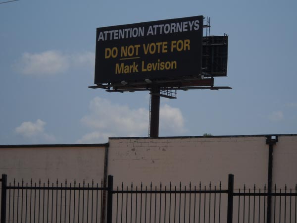 I was driving to work on a typical Friday morning when my good friend, Bob, formerly Executive Vice President and General Counsel of the town’s NFL football team, called. Bob wryly asked who I had ticked off this time. Given my profession, I told him there was a never ending line of suspects, and asked him why. Bob told me there was an enormous digital billboard on the major artery into downtown which blared, “ATTENTION ATTORNEYS DO NOT VOTE FOR MARK LEVISON”. I told Bob that only Terry Crouppen of Brown & Crouppen was likely to put up a billboard like that, but presumed Bob was playing a practical joke.