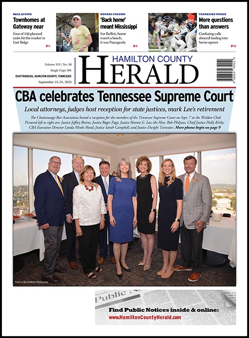 The Chattanooga Bar Association hosted a reception for the members of the Tennessee Supreme Court on Sept. 7 at the Walden Club. Pictured left to right are: Justice Jeffrey Bivins; Justice Roger Page; Justice Sharon G. Lee; the Hon. Rob Philyaw; Chief Justice Holly Kirby; CBA Executive Director Lynda Minks Hood; Justice Sarah Campbell; and Justice Dwight Tarwater.