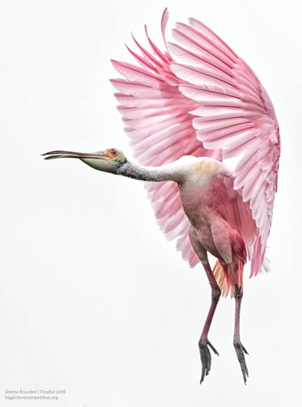 “This beautiful roseate spoonbill is flying into the nest with its wings in what is referred to as the ‘orchestra position,’” Bourdon says. “I love capturing beautiful images of nature that inspire others to fall in love with the natural world. Hopefully, my works inspire others to promote conservation and protection of these precious animals and vital resources.”