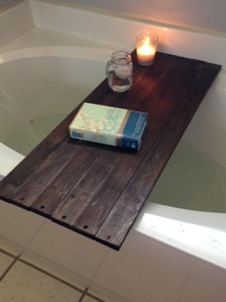 It is always nice to have a glass of ice water, a candle and maybe something to read while you are soaking, but finding a place to set it all can be a whole different issue. This is where the next greatest DIY project comes in. Making a bath shelf is very simple and great to have lying across your tub to hold necessary items.