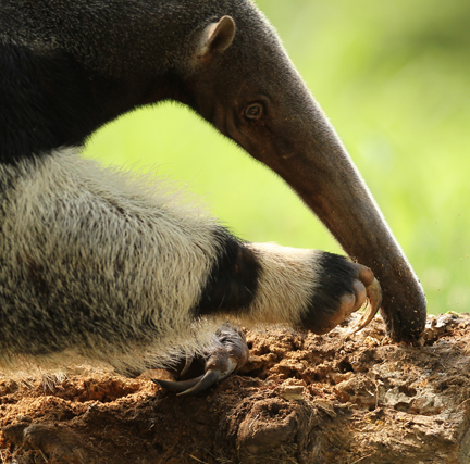 The giant anteater is an insectivorous mammal who eats mostly ants and termites – up to 35,000 each day. Anteaters can grow up to seven feet from the tip of their snout to the end of their tail and can weigh up to 140 pounds. The giant anteater species is considered vulnerable, as its population is in decline.
