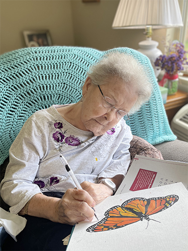 “It’s amazing to watch them develop from a tiny egg to a caterpillar and then see them transform into a chrysalis before hanging for two weeks and emerging as a beautiful butterfly,” says resident Dot Hilliard. “It’s truly a miracle.”