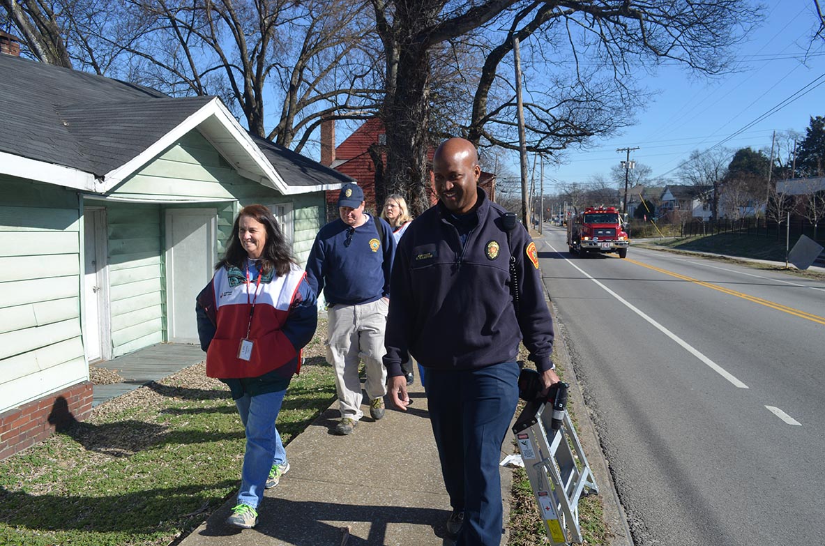 According to the Chattanooga Fire Department, two out of three home fire deaths are a result of fires in homes with no smoke alarms. To ensure residents of the Avondale neighborhood have working alarms in their homes, Chattanooga firefighters, along with staff and volunteers with the American Red Cross, distributed free alarms and batteries throughout the community last Saturday. The fire department selected the neighborhood for canvassing after responding to five fires there in 2014. The event coincided with the weekend Daylight Savings Time went into effect, which Fire Marshal Beau Matlock says is a good time to replace batteries or buy new alarms. (Photo by David Laprad)